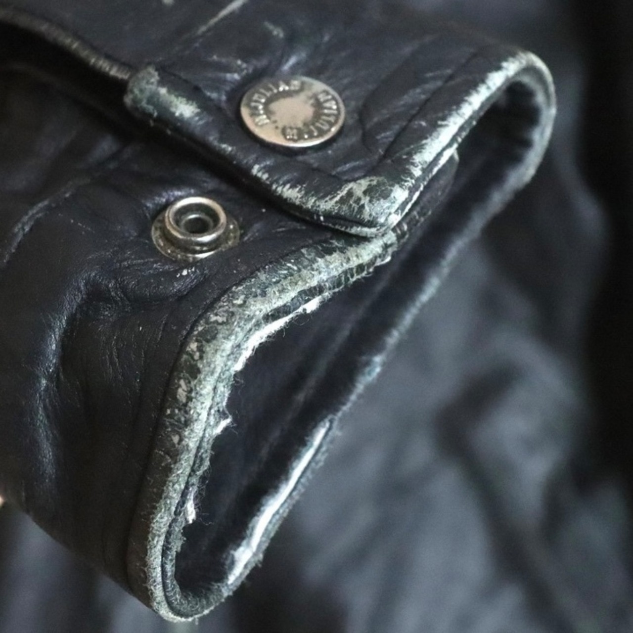 各部にレザー特有の擦れ、右袖元に汚れや使用感はありますが、まだまだ着用いただけます。
