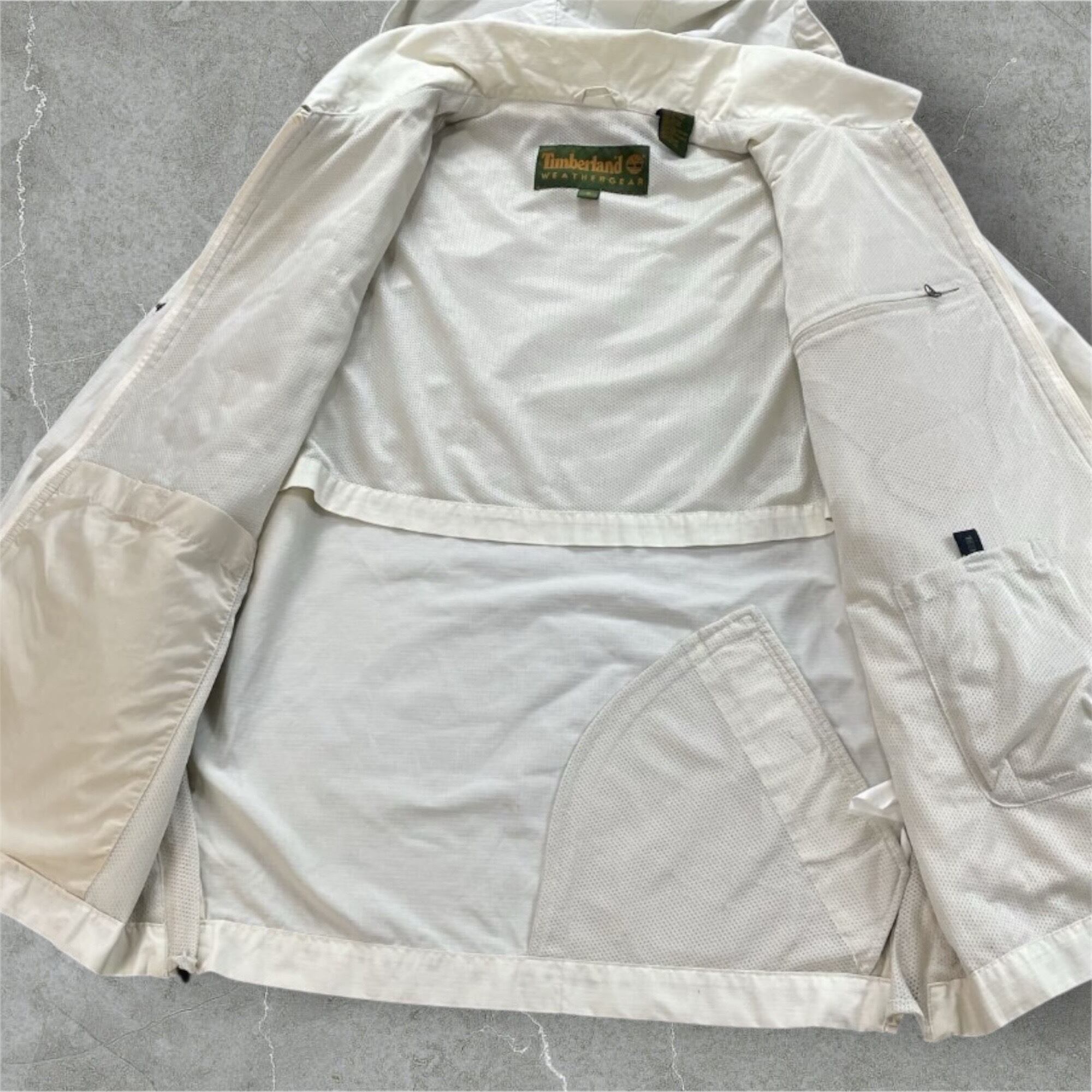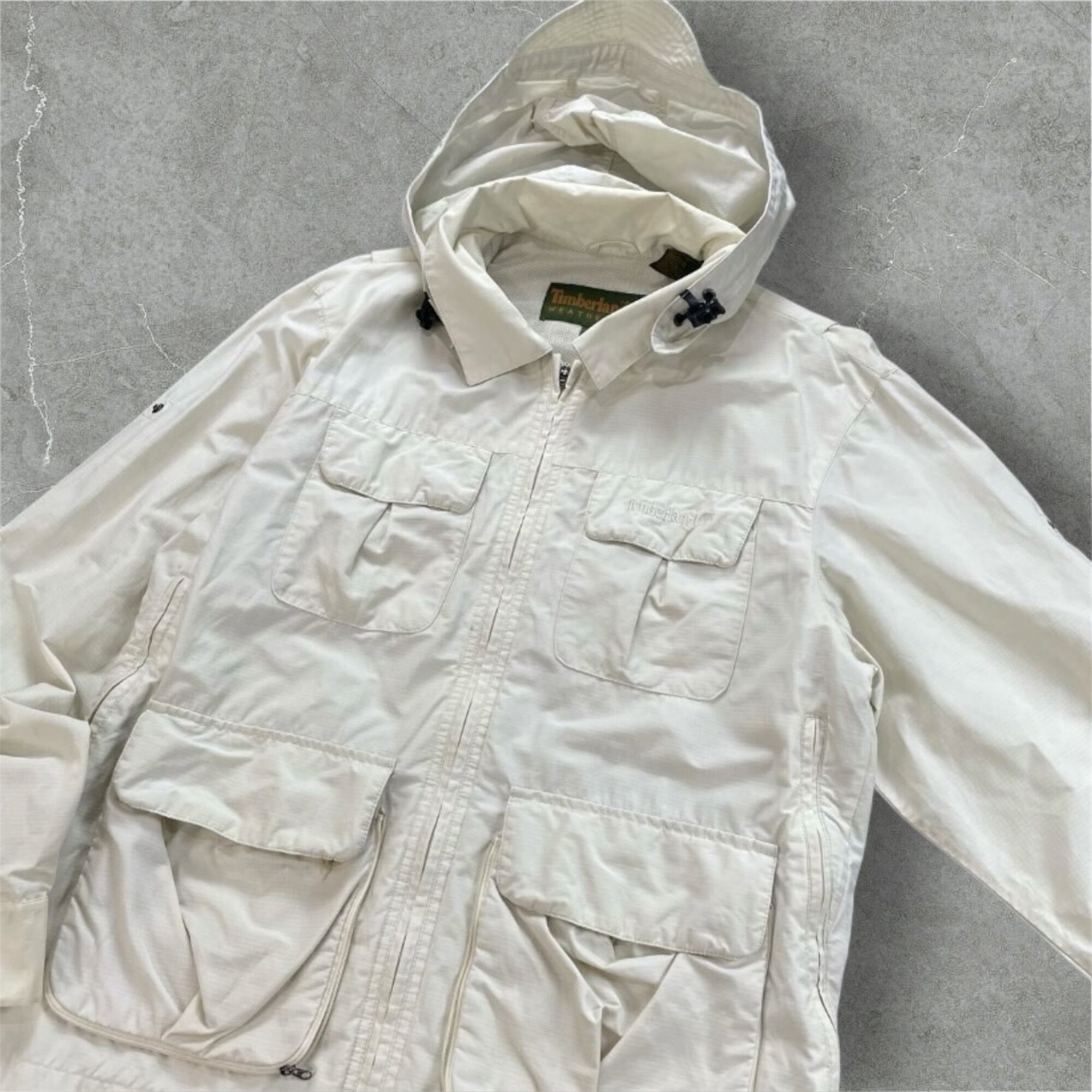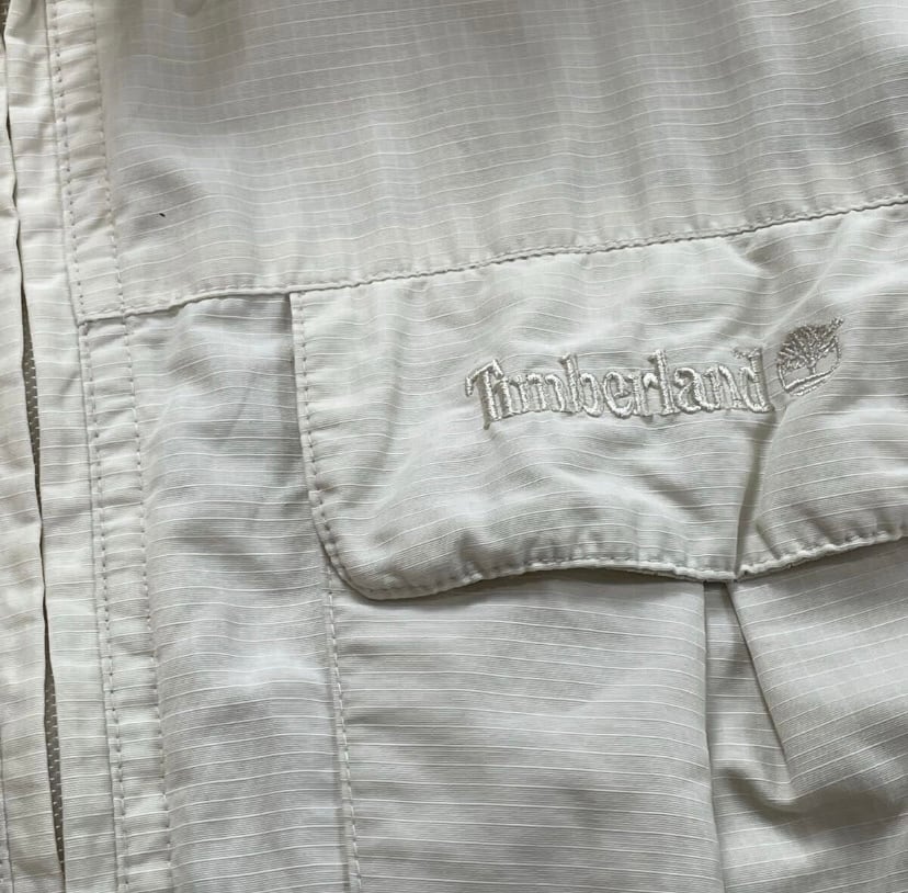 Timberlandの高機能ナイロンパーカー。フード部分にドローコードが付いており取り外しが可能。両サイドのジッパーや内ポケットなど収納や通気性にも優れている。90年代Timberlandのテック系ジャケットの名作。