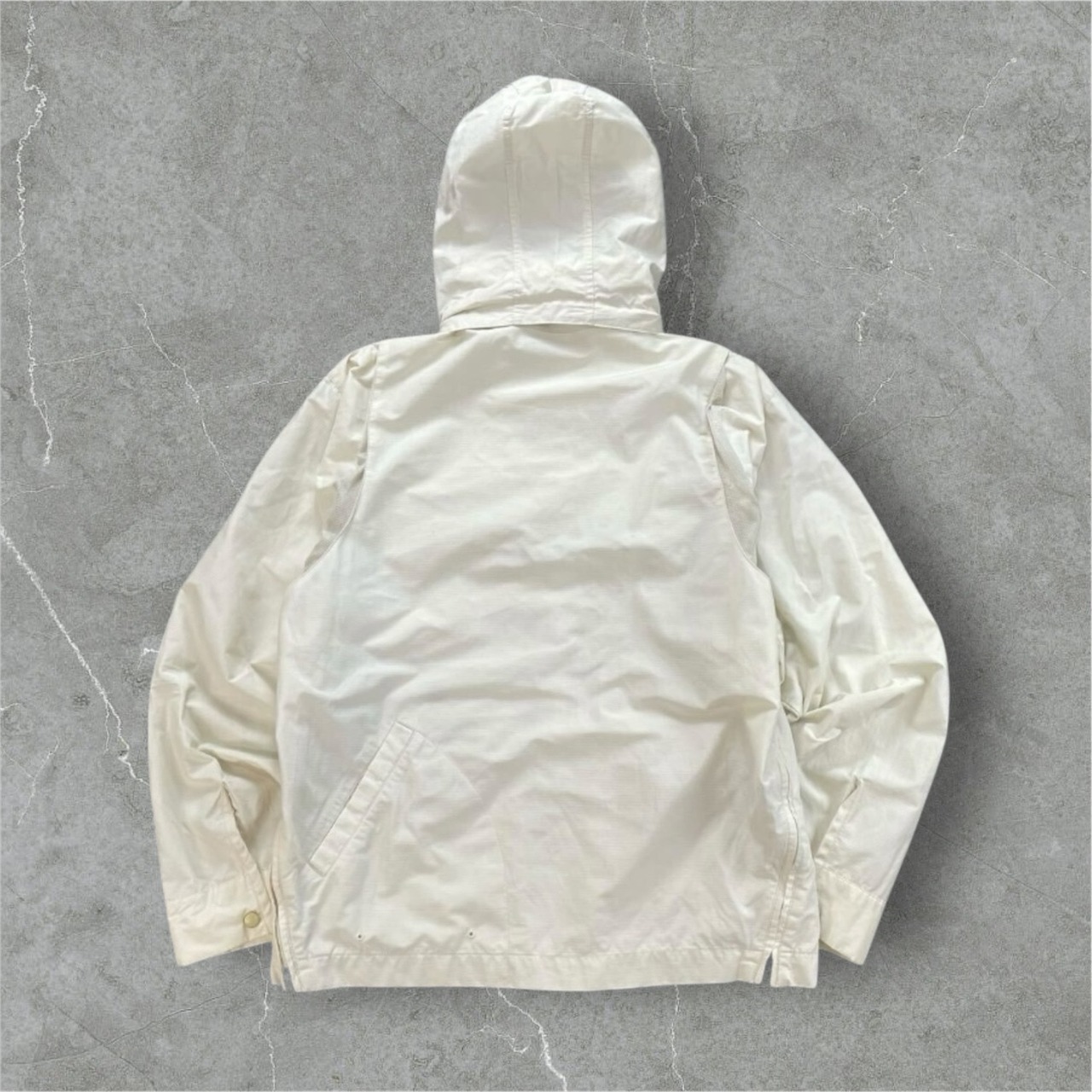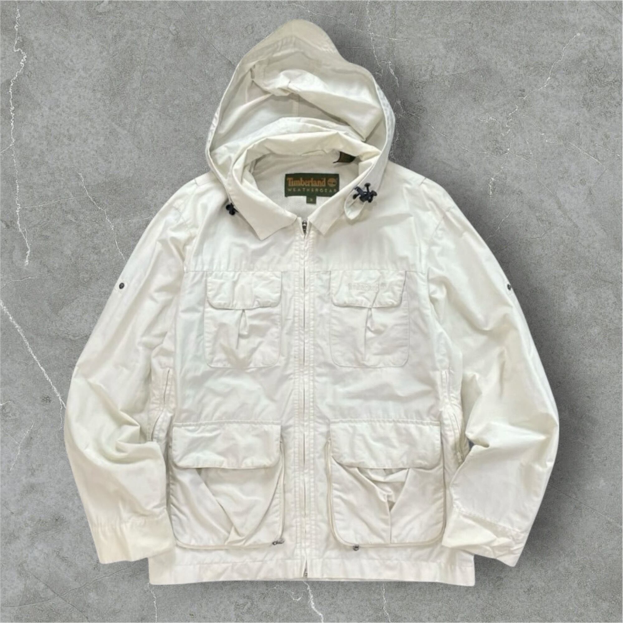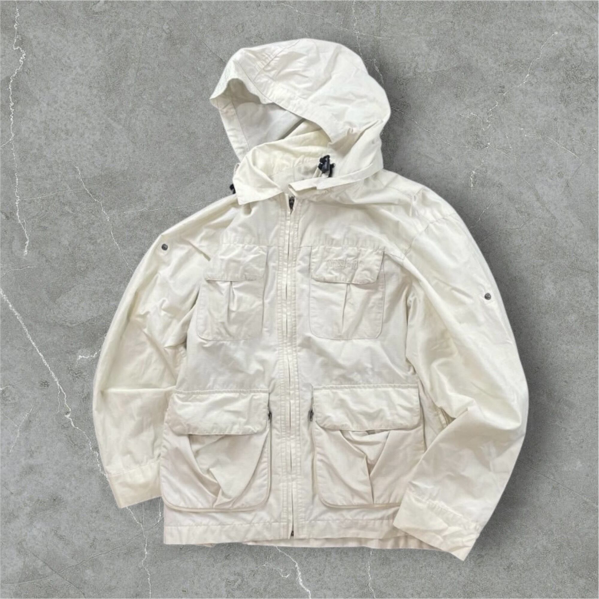 Timberlandの高機能ナイロンパーカー。フード部分にドローコードが付いており取り外しが可能。両サイドのジッパーや内ポケットなど収納や通気性にも優れている。90年代Timberlandのテック系ジャケットの名作。